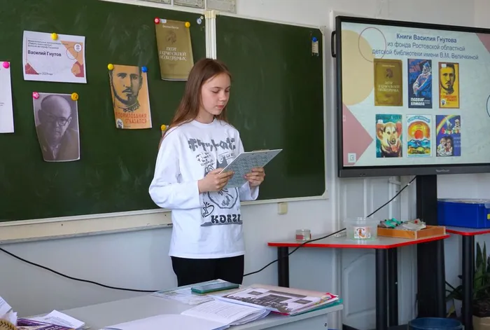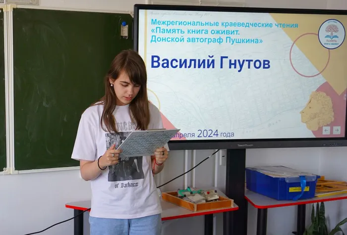 Из презентации ребята познакомились с биографией и творчеством Василия Гнутова, а затем юные читатели прочитали отрывок из произведения писателя «У лукоморья дуб зелёный», вошедшего в его авторский сборник «Поэт в краю степей необозримых». В этом сборнике Василий Петрович воссоздал картины пребывания А. С. Пушкина в 1820 году в Таганроге, Аксае, Новочеркасске, Старочеркасске и других местах Донского края.