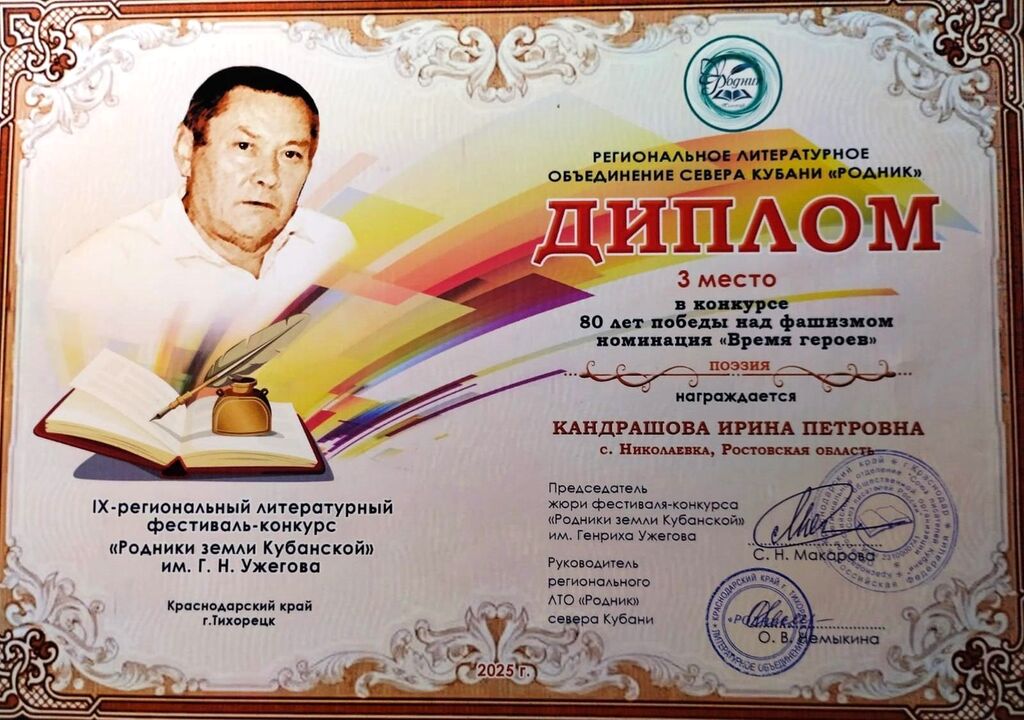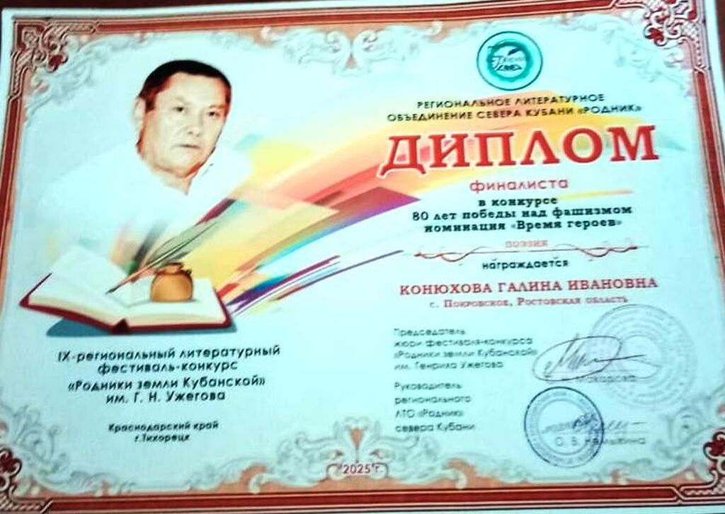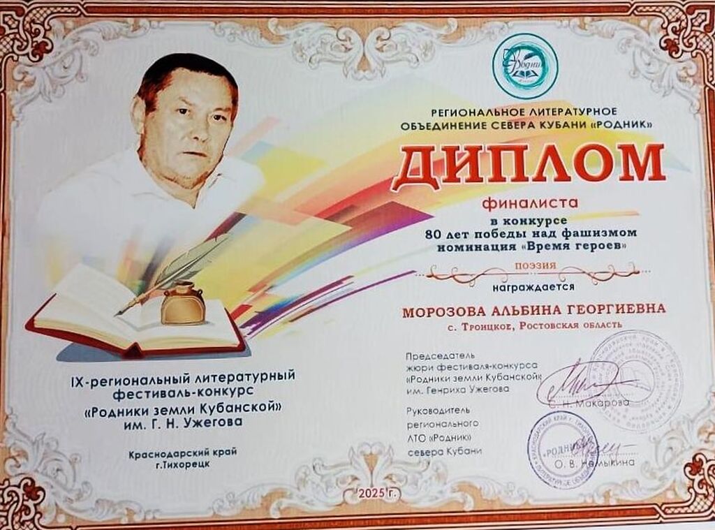 Морозова Альбина Георгиевна получила диплом финалиста со стихотворениями «Самбекские высоты»