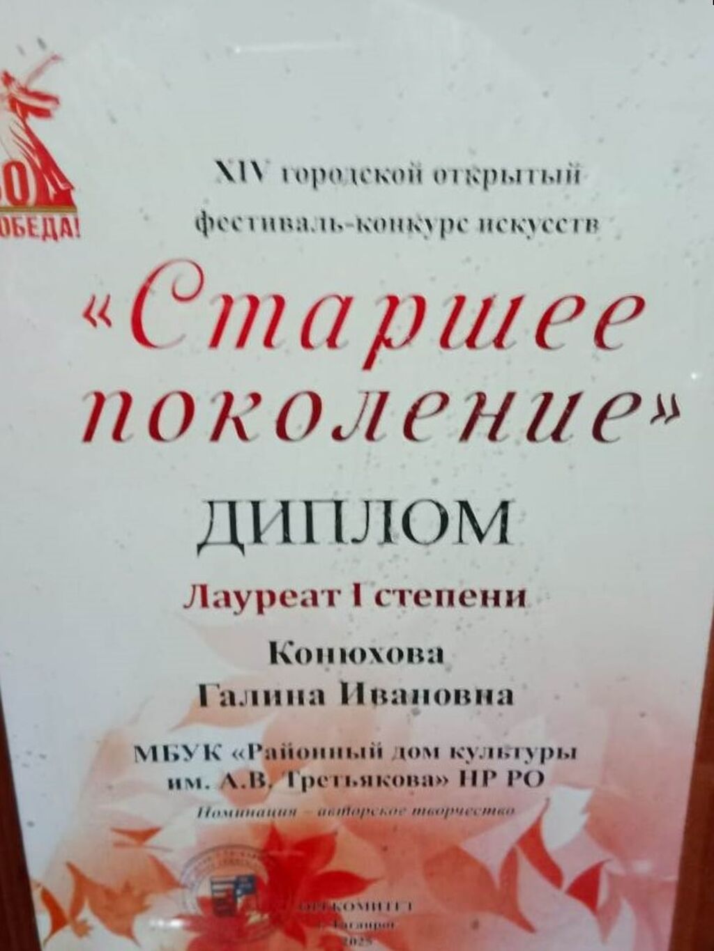 Конюхова Галина Ивановна в номинации «Авторское стихотворение» получила диплом I степени со стихотворением «Никак не проходит тревожная боль…"