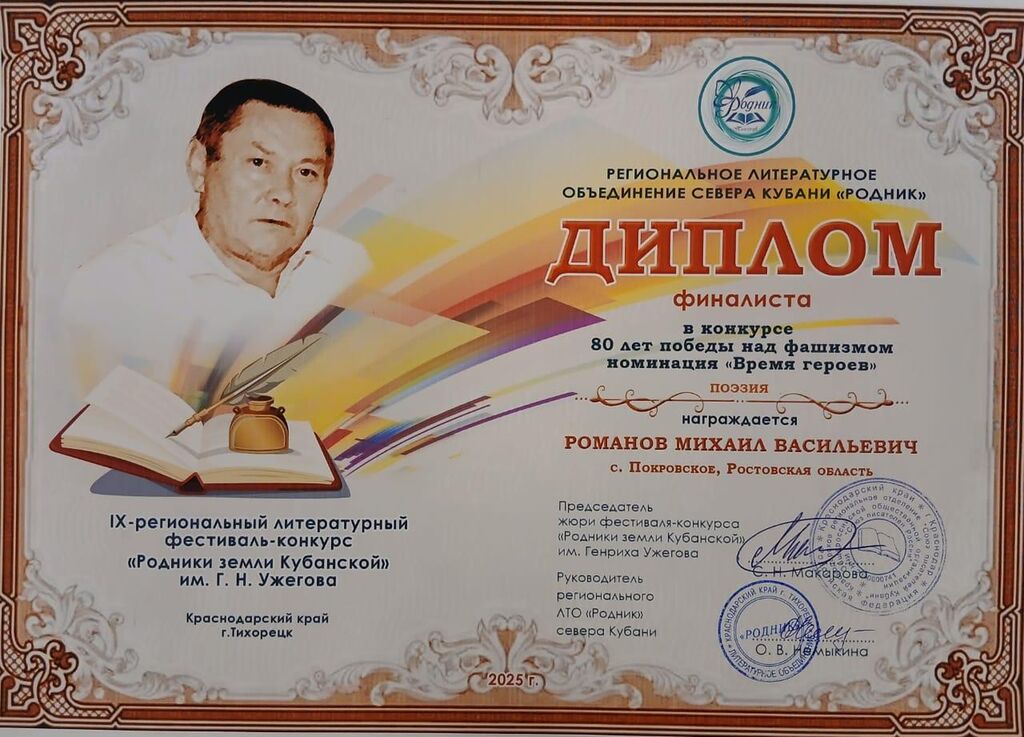 Романов Михаил Васильевич получил диплом финалиста со стихотворением «Дядя Миша»