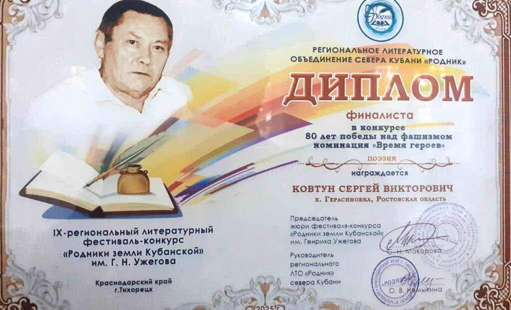 Ковтун Сергей Викторович получил диплом финалиста со стихотворением «Во мраке газовой трубы…»